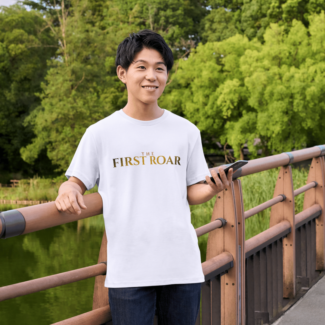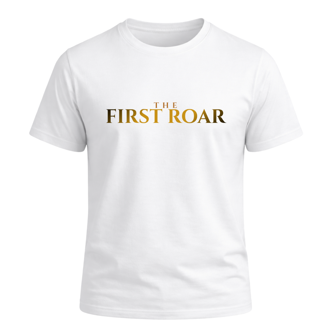 • White t-shirt with “The First Roar” design